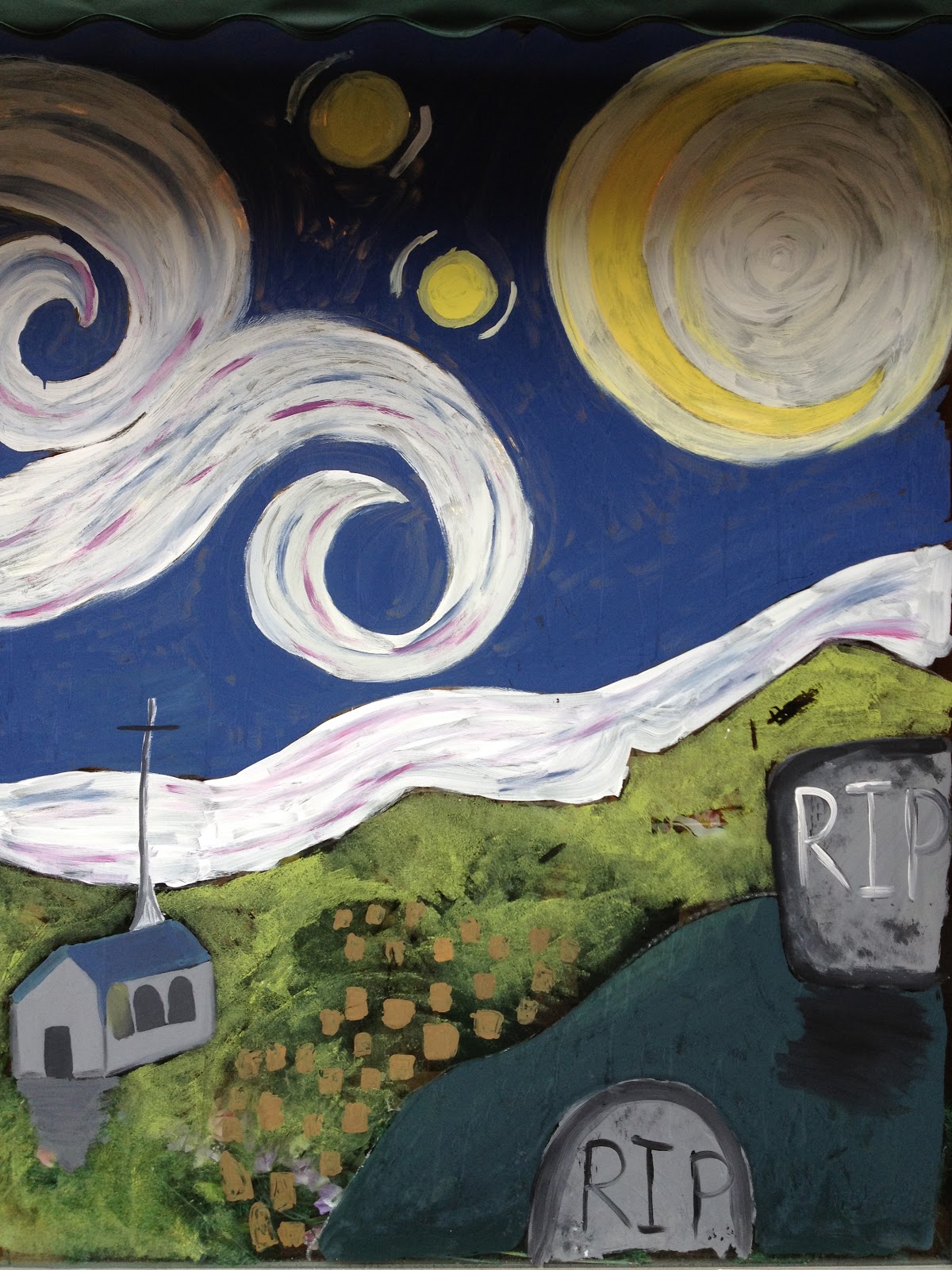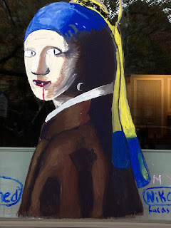 I would have posted this blog yesterday but I didn't have any power or Internet connection due to Hurricane Sandy. Anyway, every Halloween Nyack High School students paint the outsides of store windows on Main St. and Broadway in Nyack. Many of them have the focus of art history. I thought that this year's window paintings were excellent.